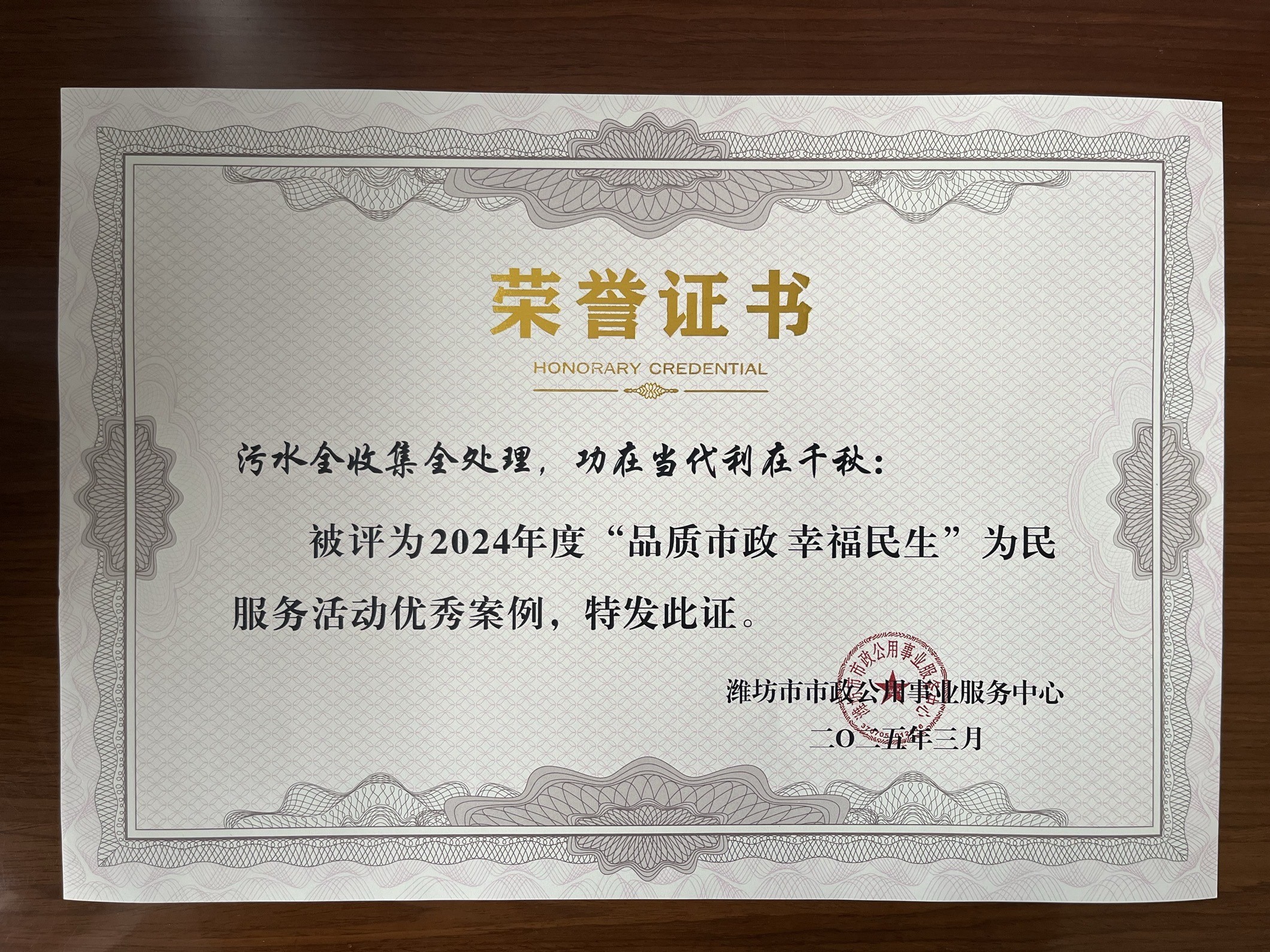 2025年3月,濰坊市市政公用事業服務中心組織開展了“品質市政 幸福民生”為民服務活動優秀案例評選活動。壽光城北水務報送的《污水全收集全處理,功在當代利在千秋》案例,在濰坊市市政公用事業服務中心2024年度“品質市政 幸福民生”為民服務活動受表揚的40個案例中脫穎而出,成為壽光市唯一獲獎的優秀案例。